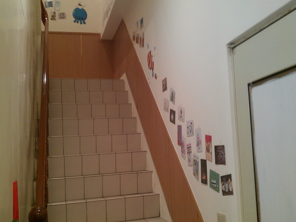 通往二樓的牆壁上貼的是店裡販售的明信片